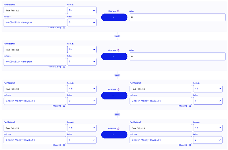 You can start creating a strategy by selecting the “Chaikin Money Flow (CMF)” indicator from the list. An example strategy is shown in the image below. You can use the CMF indicator to create a strategy after doing your own research.